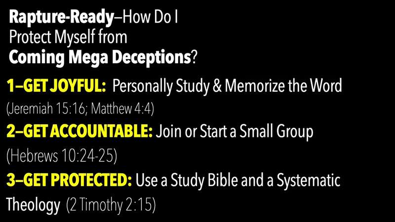So, to be Rapture ready, how do I protect myself from the coming mega-deceptions? Number one, get joyful by getting personally into study and memorization of the Word. And if you join this study, and if you're watching this you're in, okay? Just find it, it's right here on YouTube, and then it comes out later on the Academy. And to go to the Academy, you have to register and you have to give us your email address and your name and tell us what country you're from so we can pray for you and see your progress with the courses. So, if you want to be totally anonymous, go to YouTube. You can see the Thessalonians course. If you want us to pray for you to be in touch and to send you updates, then give us your email address and come through the Academy.