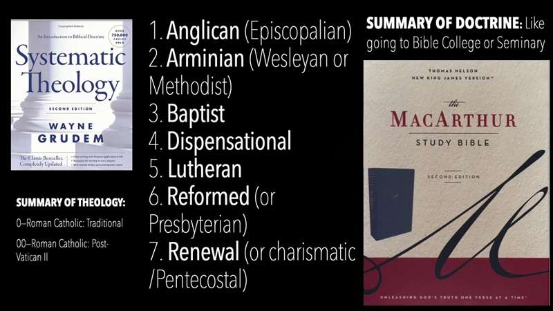 That study Bible has 31,000 footnotes, or no, 25,000 footnotes on the 31,000 verses of the Bible. John MacArthur almost has one comment on every verse of the whole Bible, and what he does is he explains to us orthodox doctrine, evangelical, solid doctrine. Now, what does Wayne Gruden do on the left systematic theology? He takes all the doctrines of the whole Bible, puts them in a blender and kind of puts them in order. They're not in biblical order. They are biblical, but they're not in biblical order. They're in systematic theological order. And then within that, he divides him into these nine divisions on the left traditional Roman Catholic theology. Roman Catholic Post Vatican II theology. Then Anglican, AKA, Episcopalian Arminian, AKA, Wesleyan or Methodist, Baptist, Dispensational, Lutheran, Reformed, or Presbyterian. That's the John Knox denomination and Renewal or Charismatic Pentecostal, those nine different areas. Do you know what those nine different areas are? Every one of you, if you're born again. In some way have been influenced by the, if you have not been influenced by one of those, then you were totally uninfluenced by your culture because that's the Christian culture around the world. So maybe if you're in Asia and from a Buddhist culture and we're totally saved by reading the Bible, you wouldn't have any of those influences. But all the people in the English-speaking world have had some. Exposure to those. What's important about that? Within all of those, there are godly Anglicans, godly Armenians, godly Baptist, godly Dispensationalist, godly Lutherans, godly Reformed, and godly Renewal, as well as godly Roman Catholics.