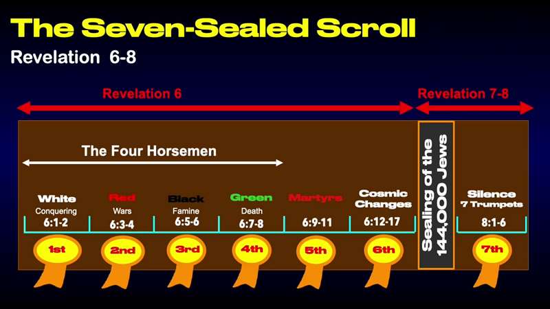 Now let's talk about what God says the world looks like. At the end. Now, Revelation 6, see in the left side of that slide. Revelation 6-8 talks about the seven sealed scroll and notice the first, second, third, and fourth seals. We know them as the four horsemen of the Apocalypse. Notice what? What's there? The white horse of deception conquering the world. The Red horse of warfare and death spilling blood. The black horse of scarcity, famine, water shortage. The green horse, chlóros is actually the Greek word. Chlóros, like chlorine, gas and Clorox, the cleaner for the laundry or whatever. It's green. That speaks of disease and death.