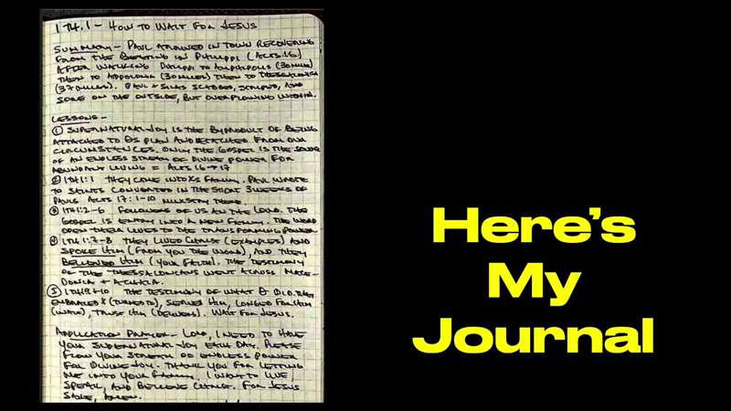 So, what am I going to encourage you to do? Well, you need to get a journal. See over there on the left side. This is, I've already done this study and I'm just going to be one week at a time sharing with you how I found all these truths and showing them to you in the text, but devotional. That's what this journal is for, to capture your devotional thoughts and lessons and truths and principles that you find how to Wait for Jesus summary. Paul arrived in town, Thessaloniki recovering from the beating in Philippi. That's Acts 16 after walking from Philippi to Amphi. From Philippi to Amphi. That's 30 miles. Then to Apollonia, that's 30 more miles. And then to Thessalonica, that's 37 miles. So, Paul and Silas were scabbed and striped and sore on the outside but overflowing within. How do you like that? That's my summary. That's what I wrote after reading chapter one. So that's my journal, and I'm going to challenge you and teach you how to do that when we start the chapters. I'm going to give you a lesson on how to do all this.