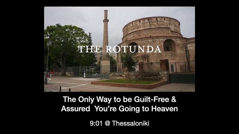 So let me take you for a moment to the Rotunda. And the Rotunda is right in the center of Modern Day Thessalonica. It's downtown, and it was built by Galerius and it was supposed to be his mausoleum, kind of like the Pantheon, kind of like the Castel San Angelo, Hadrian's tomb. It looks like the Pantheon that Hadrian built, and it looks like the Mausoleum that Hadian built, but this is Galerius a hundred years later. And look at the lesson, right under that picture. The only way to be guilt free and assured you're going to Heaven. Now for the next nine minutes, this is a class I just taught in Thessalonica. This is a field trip. I took the students right there. In fact, I'm going to be standing on the other side of that building and you're going to see it behind me the big wall there. But watch this for the next nine minutes and just let this little clip stir your heart for what is ahead as we go through each of the eight chapters, five chapters of 1 Thessalonians and three chapters of 2 Thessalonians, and as we go through that the Rapture ready living starts with being guilt free and assured you're going to Heaven. So, join me for this incredible time with the students.
