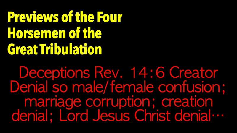 And so, do you know what the Anti-christ is going to do? There's going to be male female confusion. Now there's something to look for in the news. Are we going through the greatest, the most widespread confusion about gender specific roles and gender dysphoria? All of these terms, gender identity, gender everything. And then marriage is going to be corrupted. We've never been in a time more corrupted than right now. It's like marriage is not even on the horizon. It's not even on the map for most people. All it is sexual desires and what is going on is that God is his order. His rules are sought to be erased by the Anti-christ, and it's happening right now in our time. So, there's going to be male and female confusion as a part of the deception and Creator denial, marriage corruption, creation denial, Lord Jesus Christ, of course, denial because He's the Creator.