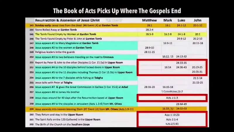 Okay, the Book of Acts picks up where the Gospels end. Now you remember, this... see what this is? P, L, and L. That's Paul's Life and Letter chart number seven. Remember that's available for you, and I'll show you in just a second where, but this is from our Holy Land class, the same chart where we take Matthew, Mark, Luke, and John, and show all the events either at 262 events that are covered in the Gospels, and look, it shows which one of the four Gospels up here records it. Now these are showing you the Upper Room because that's where actually the Book of Acts begins. And look, here it is. It's event 258. Jesus stays around for 40 days after the resurrection, basing His meeting with the disciples in the upper room. And that's where we're going to start in Acts 1:1-3. And then, the disciples go from 3-8 to the Mount of Olives. We're going there next. And then from there, Jesus ascends from the Mount of Olives to Heaven. They go back to the Upper Room, and so basically from here to here is our whole lesson today. And then when we come back, next time, they're gathered in the Upper Room, the 120 in chapter 2, and they go to the Southern Steps, and that's the day of Pentecost. So that's for you to understand Acts chapter 1, it picks up right here where the Gospels end and tells us the rest of the story.