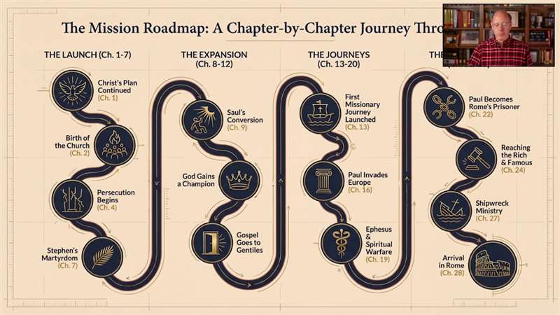 In this class, I'm talking about the launch of the Gospel in the first seven chapters, the expansion of the Gospel and all the difficulties that entails the journeys of the Gospel and the wonders that God performs, and then finally the path to Rome. And you can't quite see that because it's underneath the picture-in-picture.