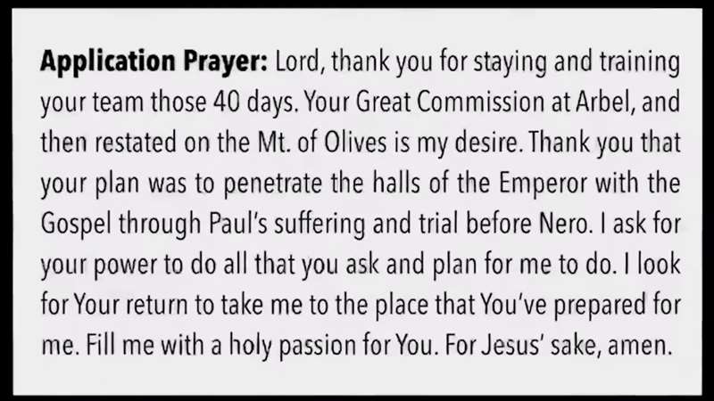Lord, thank you for staying and training Your team for 40 days. Your Great Commission at Arbel and then restated on the Mount of Olives is my desire. Thank you that Your plan was to penetrate the halls of the emperor with the Gospel through Paul's suffering and trial before Nero. I ask for Your power to do all that You ask and plan for me to do. I look for Your return to take me to the place that You've prepared for me. Fill me with the holy passion for You. For Jesus' sake. Amen.