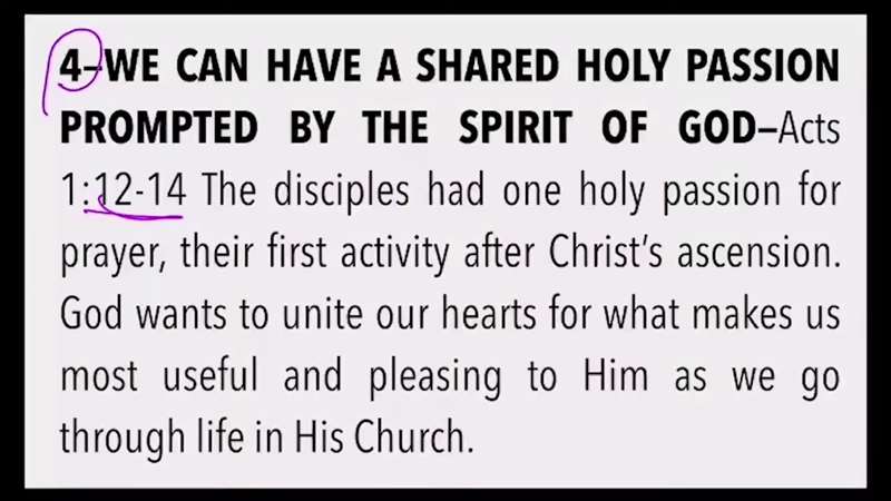 What's the fourth lesson? What in verse 12? Look over here in the Book of Acts. Chapter 1, verse 12, when they returned to Jerusalem from the Mount called Olivette. So, they were up there, I just showed it to you, which is near Jerusalem, a Sabbath day's journey. And when they had entered, they went into the Upper Room. I've already shown you that. And they were staying there. Remember, that was their base. And look at this, they continued with one accord. Do you see what I wrote in my Bible? Number one, passion to commune with God in prayer. The first activity after Christ's ascension was prayer. These continued with one accord in prayer. Now back to the slides. In Acts 1:12-14, the disciples had one holy passion for prayer, their first activity after Christ's ascension. God wants to unite our hearts for what makes us most useful and pleasing to Him as we go through life in His Church. What am I talking about?
