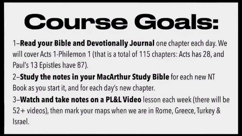 Now for this course that you're in, we have three goals. Read and devotional journal. We're on the road, Bonnie and I are on the road all the time, over 10 months a year. We were, we're leaving on Saturday. We'll be headed overseas Saturday. And it's just the beginning of a journey that's going to be at least 8, 10 weeks long. I grab my Bible and I grab my journal and whether we're in a hotel or staying in someone's home, or if Bonnie and I are staying in some dorm, every morning because I wake up early every morning, I grab my journal and my Bible, I bow my head and say, Lord, open my eyes that I behold wonderful things from Your Word. I read the scriptures. I read the chapter I'm covering and then I go back over it and fill out all the parts of our devotional study. So, look, that's number one read and devotionally journal from the Book of Acts to Philemon. Now, wherever you are. In this class, you should pause the tape or the video or whatever until you get your journal ready and you have your Bible and read, start reading in Acts 1. I just got a note from someone. They said, I'm still reading and you haven't done another lesson. I thought, good. You'll get all the way through all the chapters because the goal is for you to study these through and then to watch this class. And whatever chapter I'm covering, and let me find Acts number 1 in here, you just take notes. See I have extra space on each page. Take notes from watching this class, anything you didn't find, anything you didn't read in your MacArthur Study Bible, or anything you didn't find?