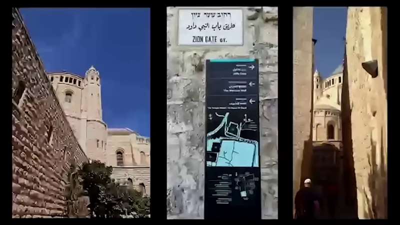 And this is the Upper Room. There's that church, the Dormition. Here's the sign. Here, walk through the Zion Gate and see the Jaffa Gate is that way. The Western Wall is that way. And look, you walk down this little corridor and you come to the Upper Room and this is where we are.