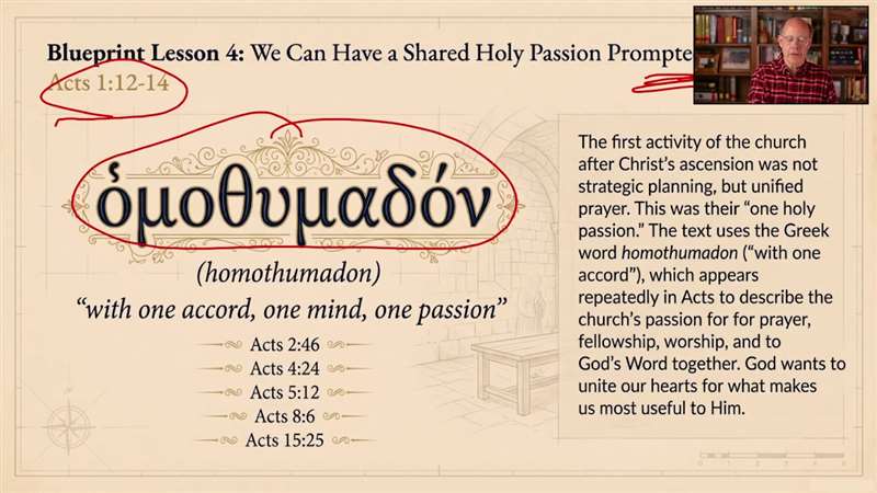 4. Homothumadon: The Holy Passion of the Church (Acts 1:12-14) As the disciples returned to the Upper Room, their very first activity was prayer. They were united by homothumadon—a Greek word meaning a shared, holy passion. You will be challenged to abandon isolation and allow the Holy Spirit to ignite a desperate passion within you for prayer, deep fellowship, and cohesive worship alongside other believers.
