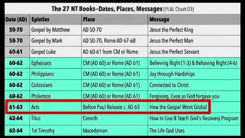 Okay, this is chart number three back to the charts you can get there on Facebook. The Book of Acts, see it's got the box around it; the red box is written sometime between 61 and 63. That means during the Caesarian imprisonment and before Paul's released from his Roman imprisonment. And the theme, see, this is the date, the name of the epistle, your place that it's written from if we know, like Corinth, Macedonia, either Caesaria or Rome, Rome, we're not sure on Matthew, and then what's the theme or message of the book? And look at this, Acts is how the Gospel went global.