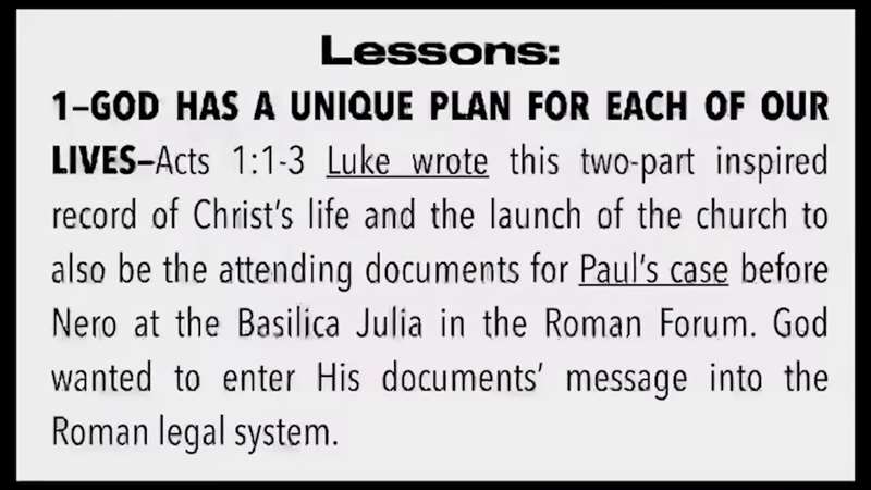 God has a unique plan for each of our lives. What was God's plan for Luke? The only thing we know Luke did is, he wrote a two-part inspired record of Christ's life, that's the Gospel by Luke and the launch of the Church, that's the Book of Acts. Why did he write them though? Most likely they were the attending documents for that other person, we're talking about Paul, his case before Nero at the Court of Rome called the Basilica Julia, in the Roman Forum. And we're going to, when we get to chapter 28, I'm going to show you the basilica. I'm going to walk around it and everything. Why? God's unique plan was that these two, Luke and Paul, were going to get God's documents, message, that's the Gospel, into the Roman legal system.
