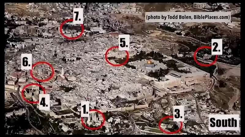 Right here is the Upper Room. This is Mount Zion. This is the last night of our Lord's life. He's having communion, launching with His disciples, communion. He goes over here to the Garden of Gethsemane. From there, He's arrested and taken to the High Priest house. He's taken from there over to see Pilate. He's taken from there to be scoured at the Antonian fortress. He's taken from there to be crucified, right here at what we would call the Church the Holy Sepulchre And then He is taken outside the city to be buried right here in what we call the Garden Tomb. Again, this is an incredible picture by my friend Todd Bolen, who did all these aerial shots and labels them.