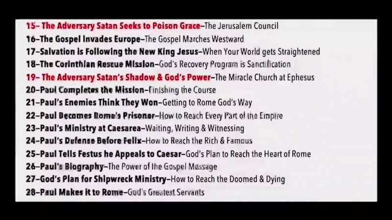 So, Satan starts to poison the Gospel of grace, and that's what chapter 15 is about. Paul invades Europe and the Gospel marches westward, aren't you glad that it got to us? Salvation is following a new king named Jesus. Paul starts the Corinthian rescue mission. Look at his theme we're going to study, God's recovery program is sanctification. By chapter 19 Satan's busy again. And his shadow is over the city of Ephesus and he's got all kinds of demon powers, but God's power is greater. And the miracle of a church at Ephesus, one of the greatest miracles in the Bible. Then chapter 20, Paul completes his mission. He finishes the course. His enemies think they won. They get him in jail. He becomes Rome's prisoner. And look, that's how to reach every part of the empire.